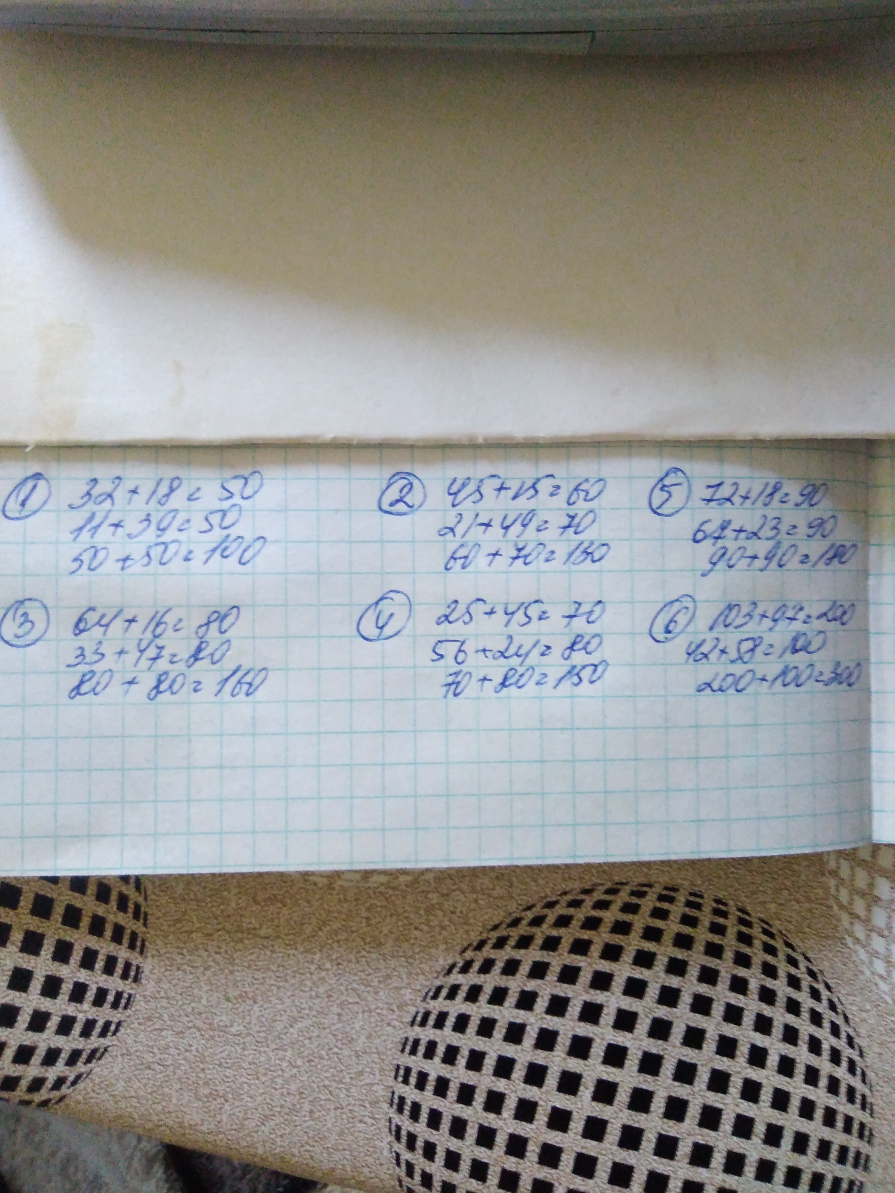 вычислите,используя переместительное и сочитательное свойства сложения: 32+11+18+39;,45+21+15+49;,64+33+16+47;,56+25+45+24;,72+67+23+18;,97+42+58+103