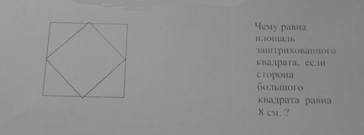 Площадь заштрихованного квадрата S=64-32=32 (т.е. площадь большого квадрата отнять четыре площади треугольников)