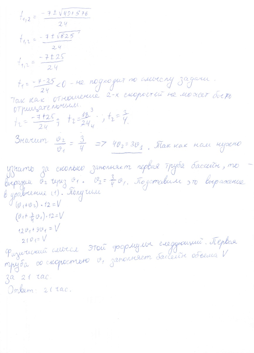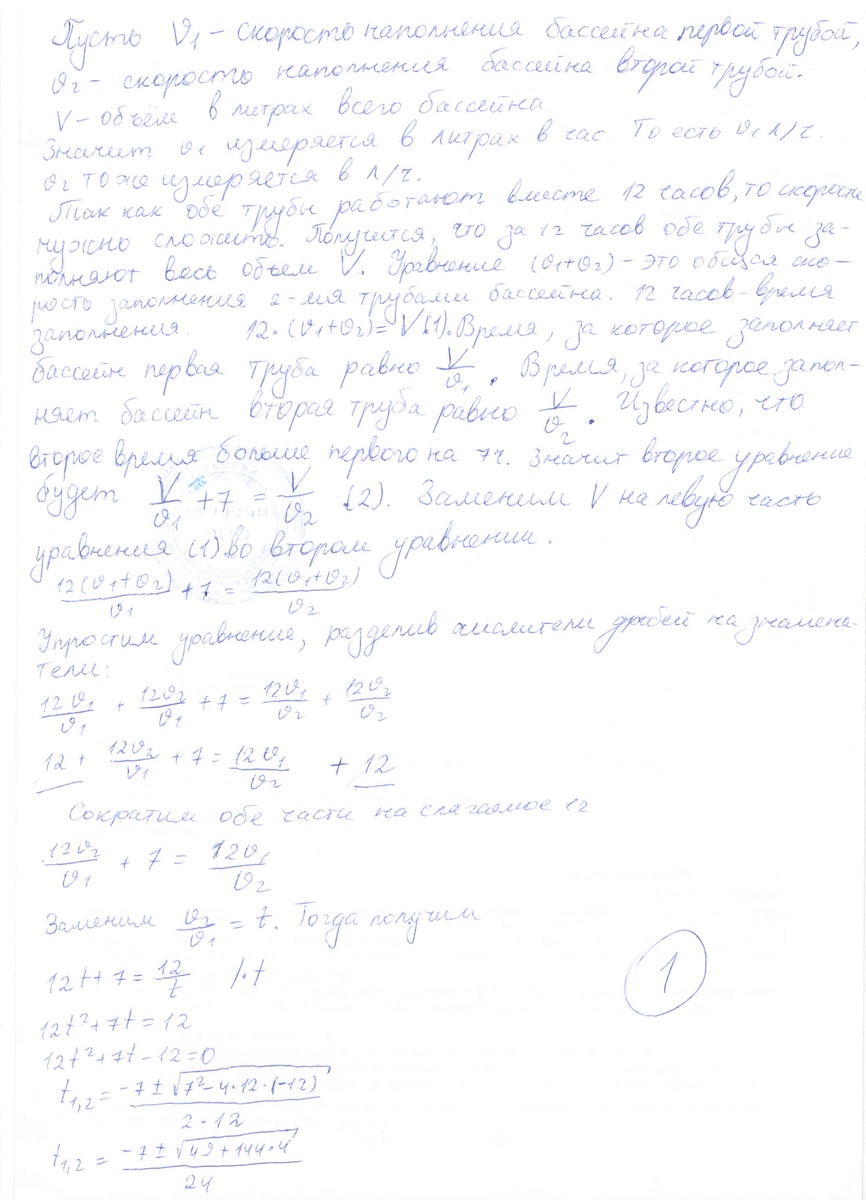 Бассейн наполняется двумя трубами за 12 ч. Первая труба, работая отдельно, может заполнить на 7 ч. быстрее второй. За сколько часов наполнит бассейн первая труба?