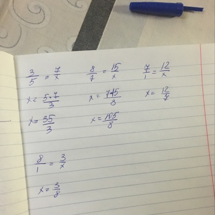 И вот это пж: 3/5=7/x; 8/7=15/x; 7/1=12/x; 8/1=3/x ПОЖАЛУЙСТА, ДО УРОКА ОСТАЛОСЬ 3 МИНУТЫ, ПЖЖЖЖ