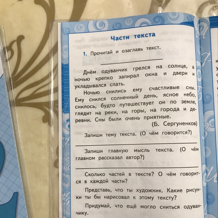 4. 2 части в тексте. 1 часть (Днем одуванчик..) : "Одуванчик днем грелся на солнце, а ночью запирал окна и укладывался спать" . 2 часть: "Ночные сны".
