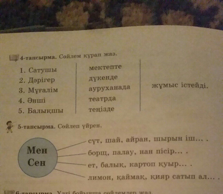 Сатушы дукенде жумыс истейди. 2 даригер ауруханада жумыс истейди 3 мугалим мектепте жумыс истейди 4анши театрда жұмыс істейді 5балыкшы жумыс истейди я казашка