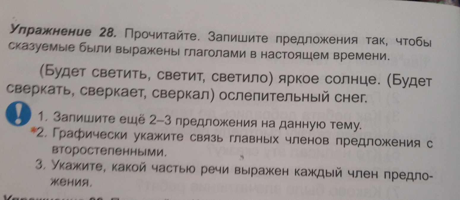 Светит(глагол) яркое(прилагательное) солнце(существительное)