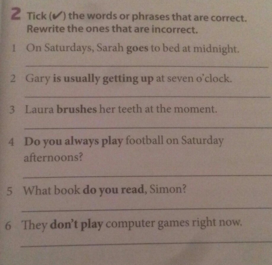 1. √ / 2. usually gets up / 3. is brushing / 4. √ / 5. are you reading / 6. aren't playing.
