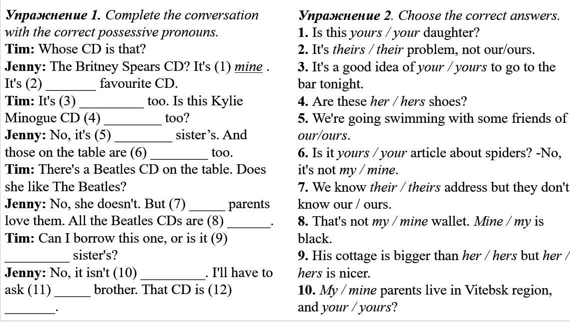 1) your. 2) their / ours. 3) your. 4) her. 5) ours. 6) your / mine. 7) their / ours. 8) my / my. 9) her / hers. 10) my / yours.