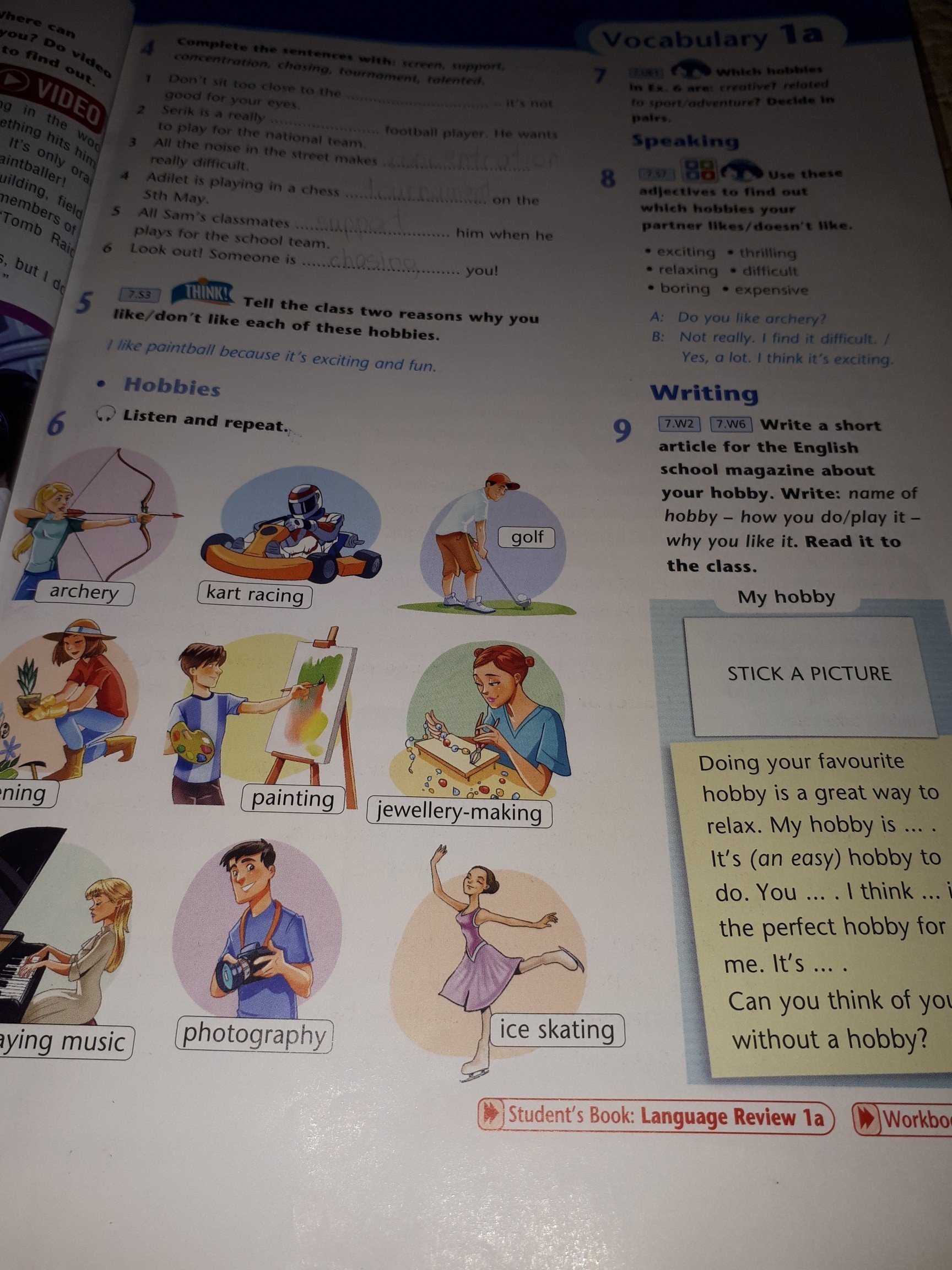 В седьмом работать с парой и определить какие из хобби креативные какие относятся к спорту и какие к путешествии.