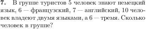 В группе туристов 5 человек знает немецкий, 6 человек французский, 7 человек Английский, 10 человек владеют двумя языками, а 6 человек тремя. Сколько человек в группе?!