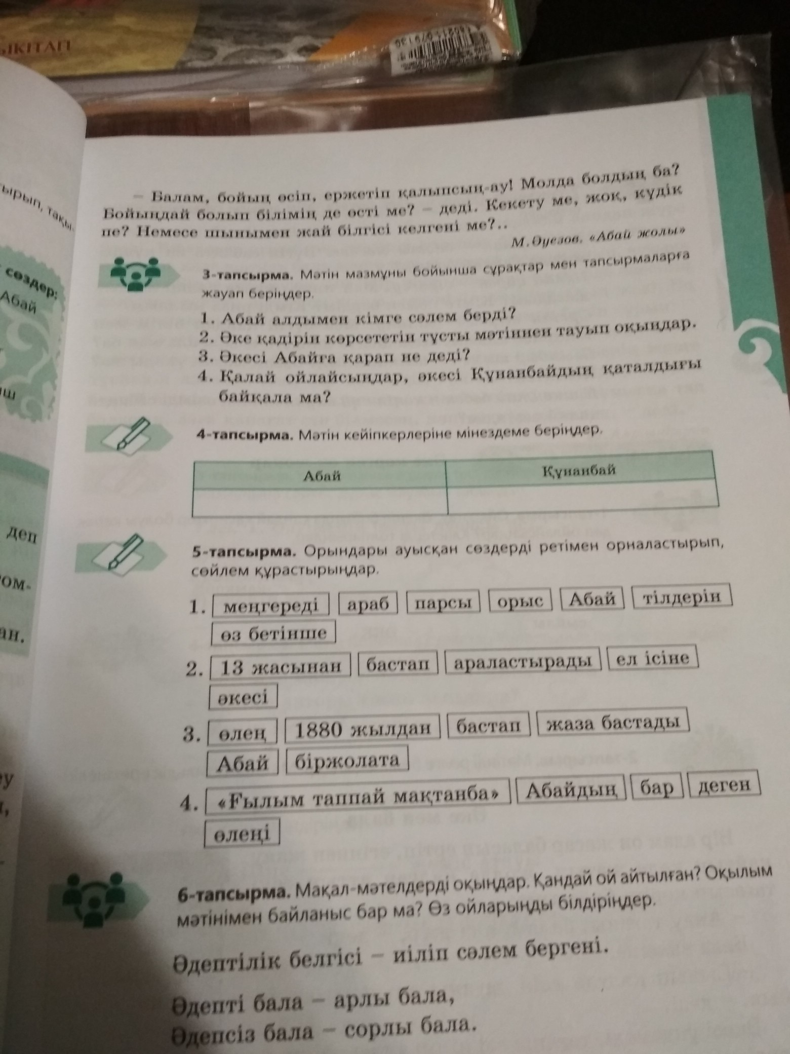 1. Абай өз бетінше араб, парсы, орыс тілдерін меңгереді 2. Әкесі 13 жасынан бастап ел ісіне араластырады 3. Абай 1880 жылдан бастап біржолата өлең жаза бастады 4. Абайдың "Ғылым таппай мақтанба" деген өлеңі бар