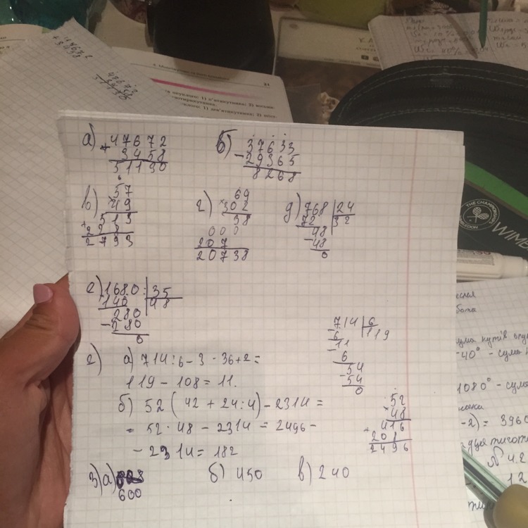 2. а) 714 : 6 – 3 * 36 + 2 = ? б) 52 * (42 + 24 : 4) – 2314 = ?