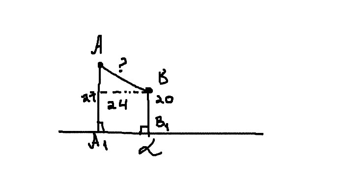 Точки А1 и В1 являются основаниями перпендикуляров, опущенных из точек А и В на плоскость а(альфа), соответственно: Найдите: б)АВ, если АА1=27мм, ВВ1=20мм, А1В1=24мм