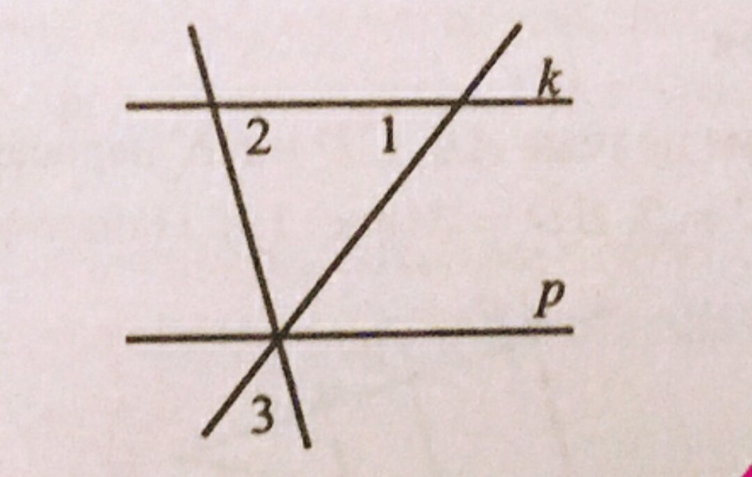 Прямые p и k параллельны. Найдите угол 3, если угол 1 = 71 градус, угол 2 = 58. Ответ дайте в градусах