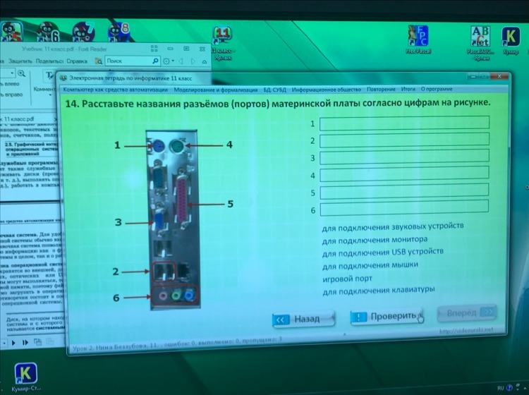 1 для мышки, 2 для подключ. юсб устройств.3 для монитора.4для клавитуры.5игровой порт.6 для звуковых устройств