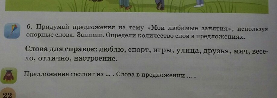 Я люблю спортивные игры на улице(6 слов) . Я люблю играть с друзьями в мяч на улице(9 слов) .После игр на улице, у меня отличное настроение(8 слов).