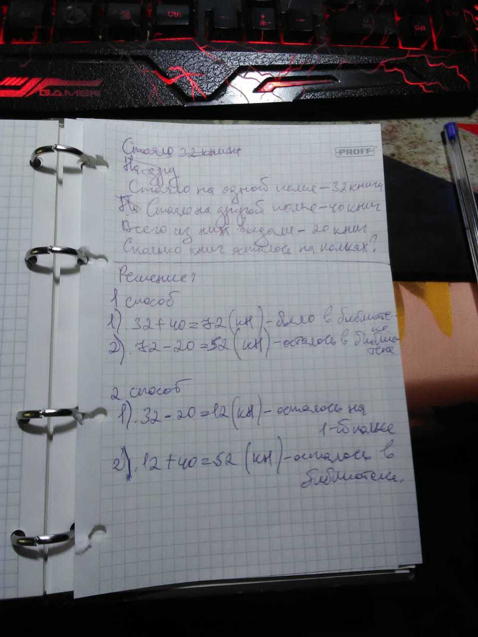 В библиотеке на одной полке стояло 32 книги, а на другой - 40 книг. Из них детям выдали 20 книг. Сколько книг осталось на этих полках? Реши задачу разными способами. Скажите пожалуйста правильно ли решение у меня написано и как написать конечные ответ и нужен ли он когда два способа просят написать?