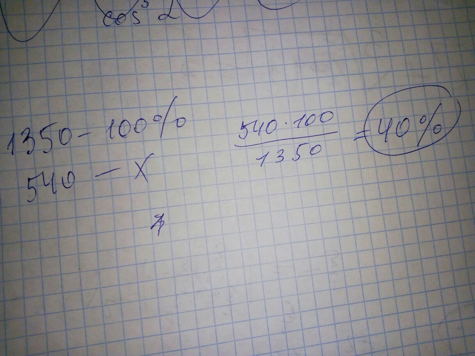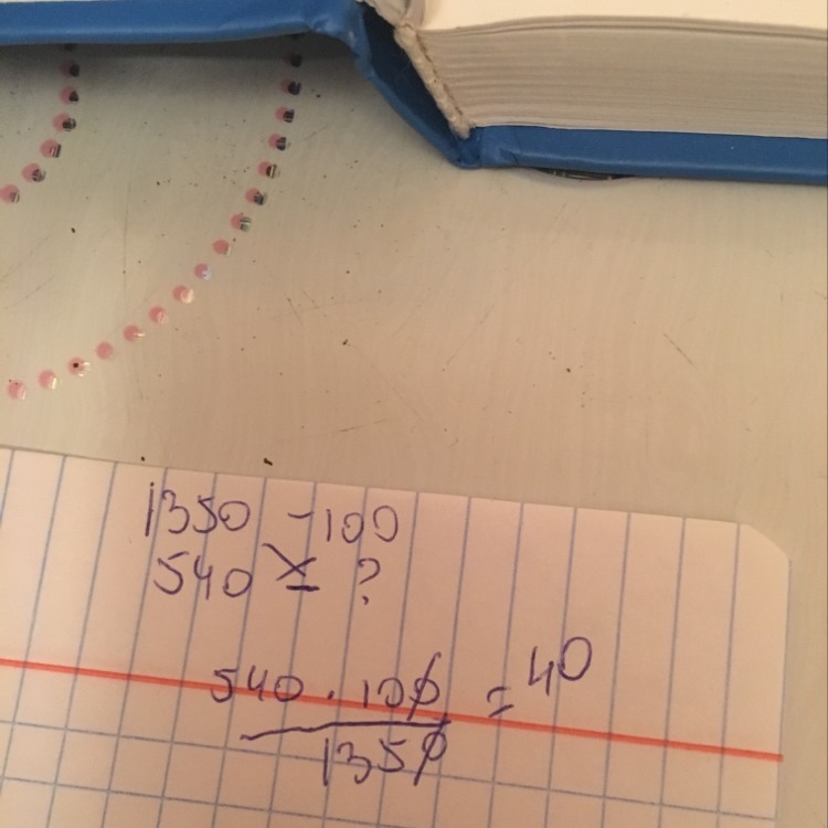 У мамы было 1350 рублей. Она на продукты истратила 540 рублей. Сколько процентов денег она истратила?
