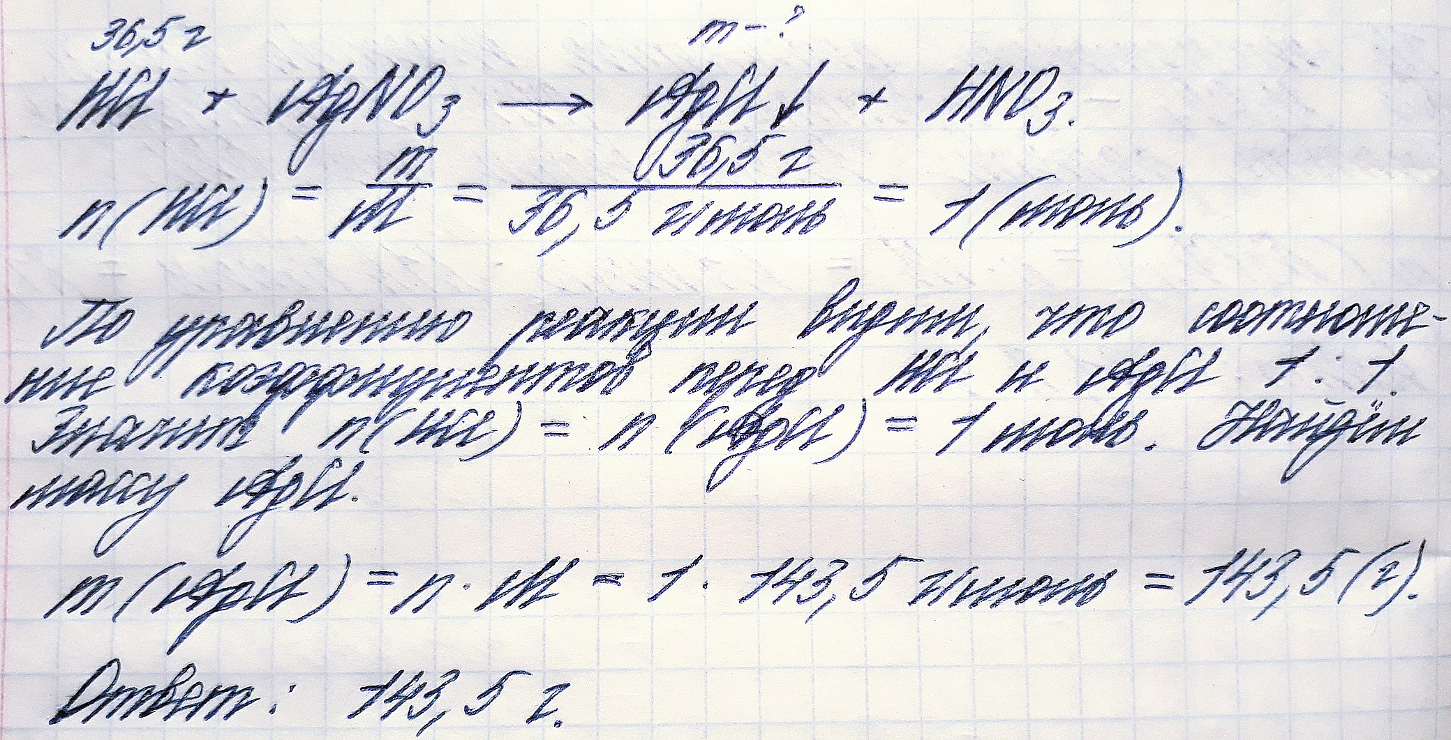 Вычислить массу осадка, которая образуется при взаимодействии 36,5г р-ра соляной кислоты с нитратом серебра