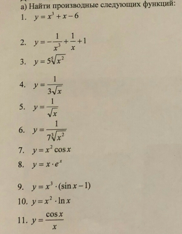 Во-первых, нужно выучить правила дифференцирования ( правила нахождения производных). А есть ещё формулы для нахождения производных конкретных функций (прикреплены выше). Решать легко всё на самом деле , нужна практика. Потом будешь видеть где,что и как применить . Решения : у = х^3+х-6; у'(х) = 2х^2+1. Объясню как я это нашёл. 1). Здесь используется правило : производная суммы (разности) равна сумме производных . 2). Начинаем применять формулы из таблицы сверху : а). х^3 - это степенная функция для неё применяем формулу а^n=n*а^n-1. --- получаем 2х^2; б). Производная от х = 1 ( формула сверху тоже ) в). Производная от числа , в нашем случае от 1 - равна 0. Это правила дифференцирования и их надо знать : производная от числа - 0; Производная от х=1; производная суммы равна сумме производных. В общем правила прикреплю. Завтра прикреплю решение остальных .