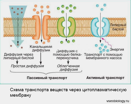 Транспорт через клеточную мембрану бывает активный (с затратой энергии) и пассивный ( без затраты энергии)