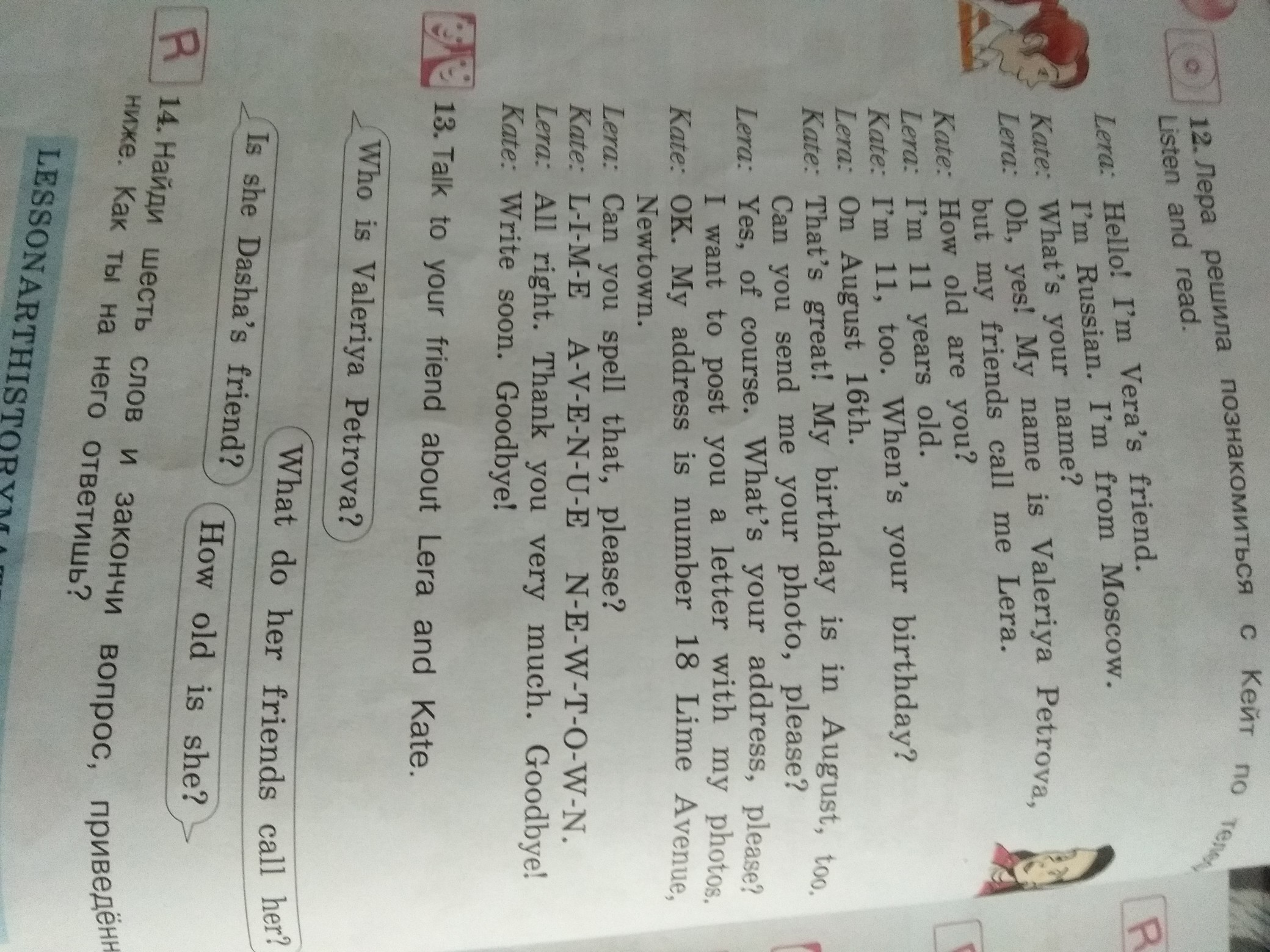 Хеллоу ай ам рашиян ай ам фром москоу уатс йёр нейм оу йес май нейм из валерия петрова бат май френдс колл ми Лера хау олд ар ю ай ам елевен йеарс олд айм елевен йеарз олд туу уен из ёрс борстдей огст сикстиинт ит из грейт май бортсдей из ин огст туу кан ю сенд ми ёур фото плиз йес оф коурс уатс ёр адресс плиз ай уант то пост ю а леттар уиз май фотоуз май адресс из намбе ейтин лайм авеню нютаун кан ю спелл зат плиз лайм авеню нютаун ол райт тханк ю вери мач гудбай райт сун гудбай
