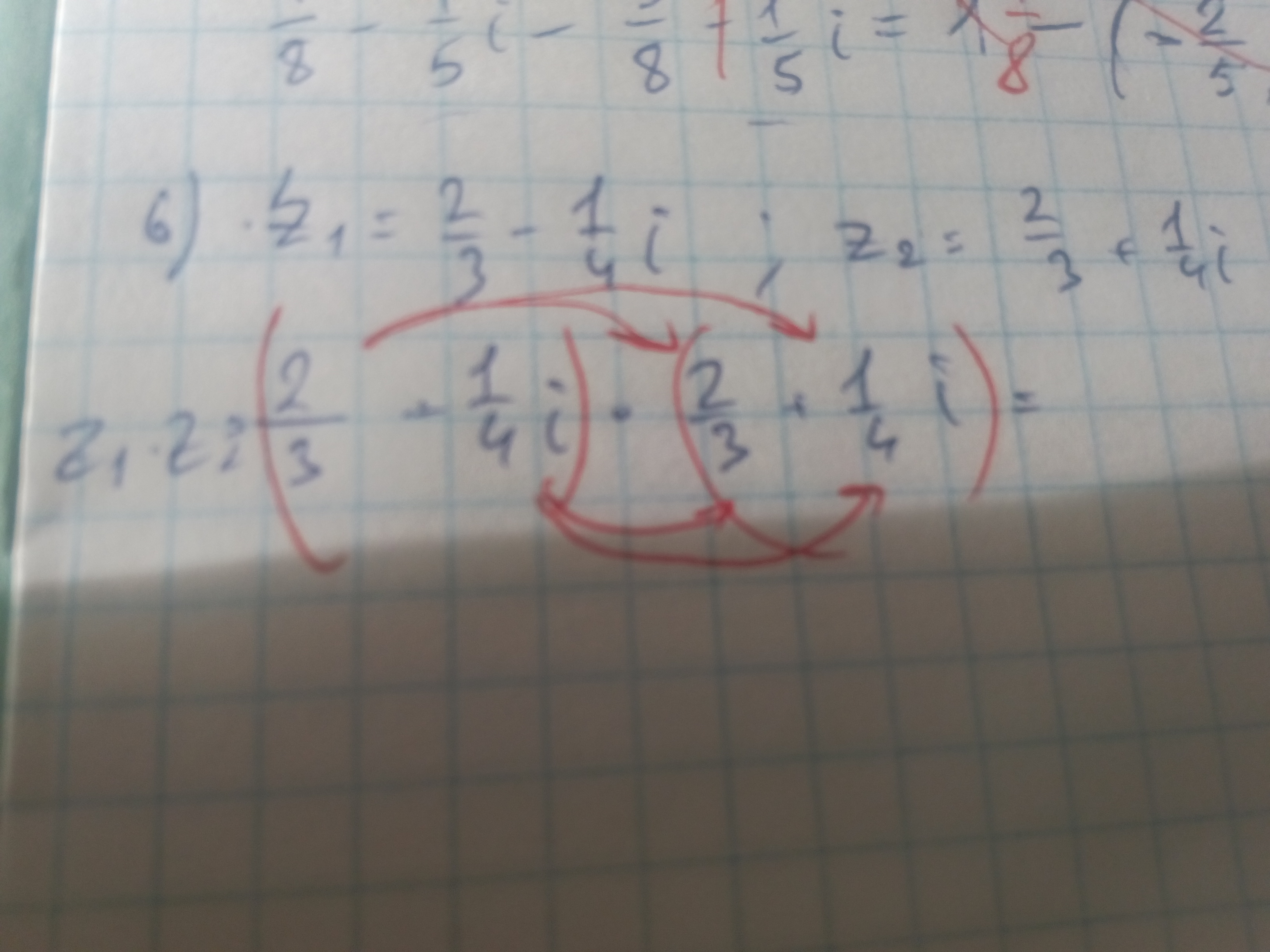 Так и перемножаем два двучлена, по стрелкам: =4/9+2i/12-2i/12-1i²/16=4/9+1/16= (64+9)/144=73/144 (знаем, что i²=(√-1)²=-1)