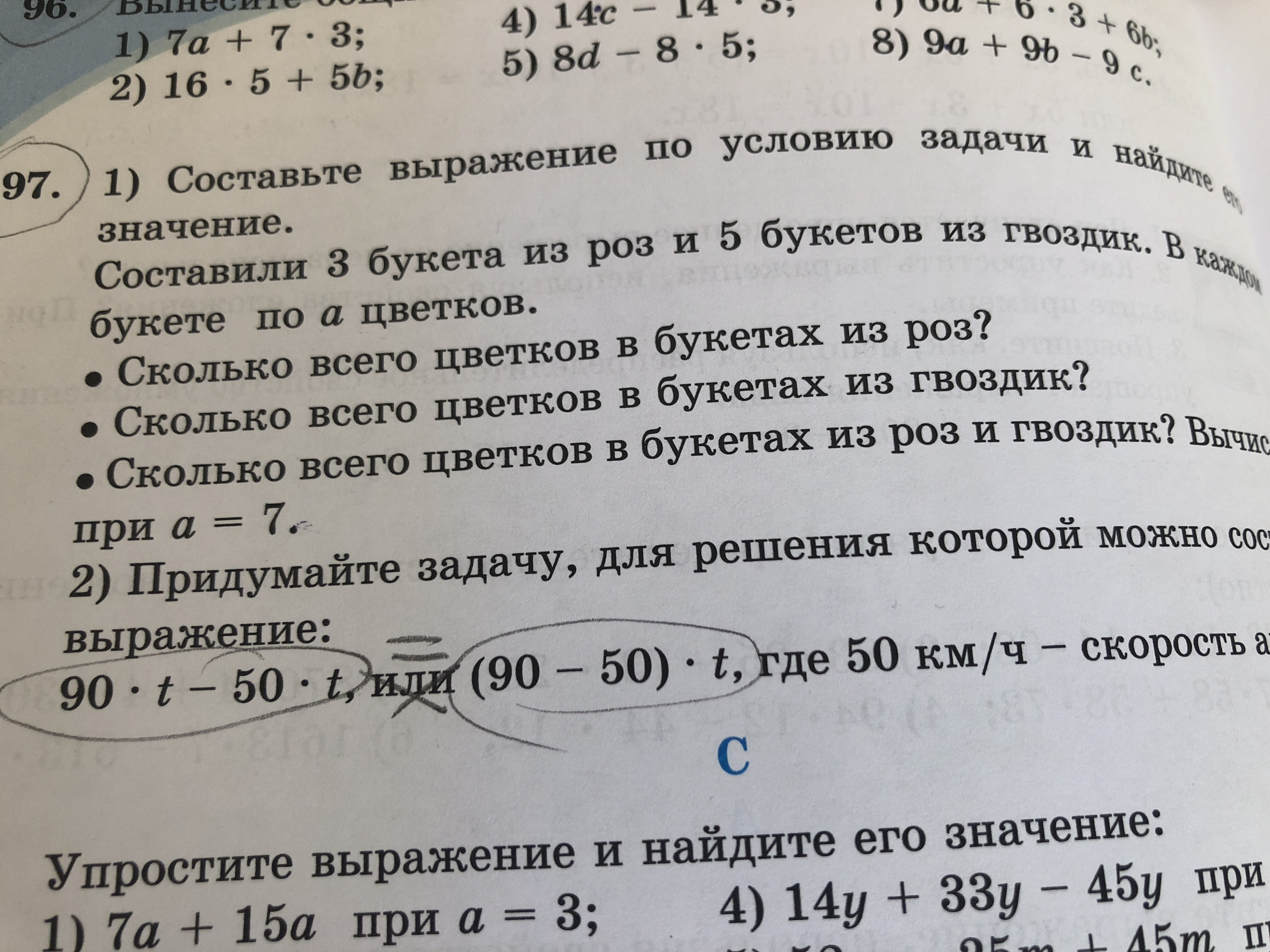 3*а цветков роз в букетах 5*а цветков гвоздик в букетах 3*а+5*а=(3+5)*а=8а при а=7 в букетах из роз и гвоздик 8*7=56 цветков Ответ:всего 56 цветков