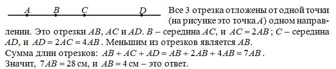 на прямой от одной точки в одном направлении отложены три равных отрезка так что конец первого отрезка служит серединой второго а конец второго серединой третьего Длина отрезка концами которого служит начало первого и конец третьего отрезка равна 28см Найдите длину этих отрезков