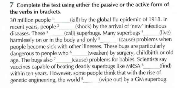 30 million of people were 1. killed by the global flu epidemic of 1918. In recent years , people were 2.shocked by the arrival of new infections disease. These 3. were called superbugs. Many superbugs 4. lived harmlessly on or in the body and only 5. caused problems when people becom sick with other illnesses. These bugs are particulary dangerous to people who 6. are weaken by surgery, childbirth or old age. The bugs also 7. cause problems for babies. Scientists say vaccines capable of beating deadly superbugs like MRSA 8.will be find within ten years. However some people think that with the rise of genetic engineering, the world 9. will be wiped out by a GM superbug.