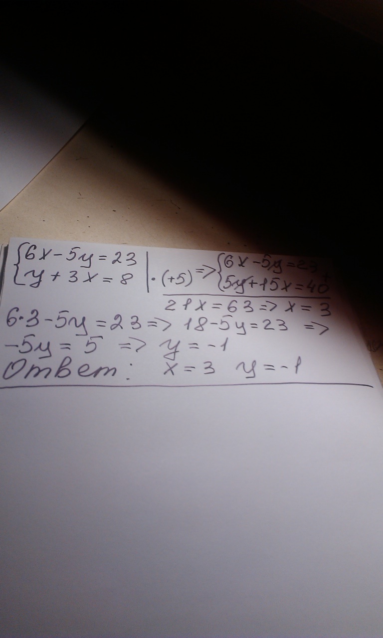 Решите систему уравнений методом сложения: {6x-5y=23 ; 3x +y =8 .