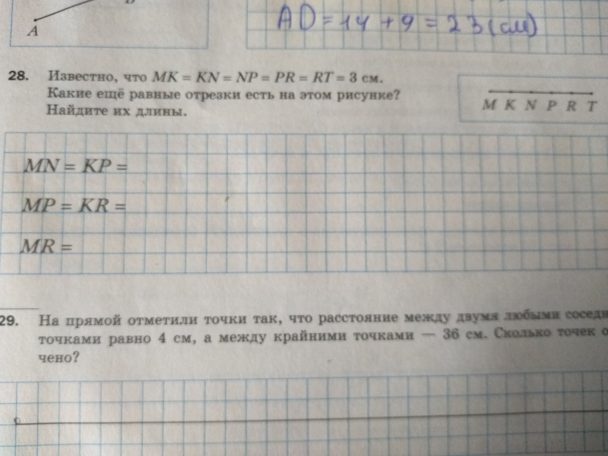 Известно, что МK=KN=NP=PR=RT=3 см Какие ещё равные отрезки есть на этом рисунке? Найди их длины.