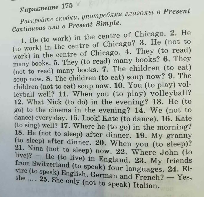 1. He works in the centre of Chicago. 2. Does he work in the centre of Chicago? 3. He doesn't work in the centre of Chicago. 4. They read many books. 5. Do they read many books? 6. They don't read many books. 7. The children are eating soup now. 8. Are the children eating soup now? 9. The children aren't eating soup now. 10. Do you play volleyball well? 11. When do you play volleyball? 12. What does Nick do in the evening? 13. Is he going to the cinema in the evening? 14. We don't dance every day. 15. Look! Kate is dancing. 16. Does Kate sing well? 17. Where does he go in the morning? 18. He doesn't sleep after dinner. 19. My granny sleeps after dinner. 20. When do you sleep? 21. Nina isn't sleeping now. 22. Where does John live? – He lives in England. 23. My friends from Switzerland speak four languages. 24. Does Elvire speak English, German and French? – Yes, she does. 25. She doesn't only speak Italian.
