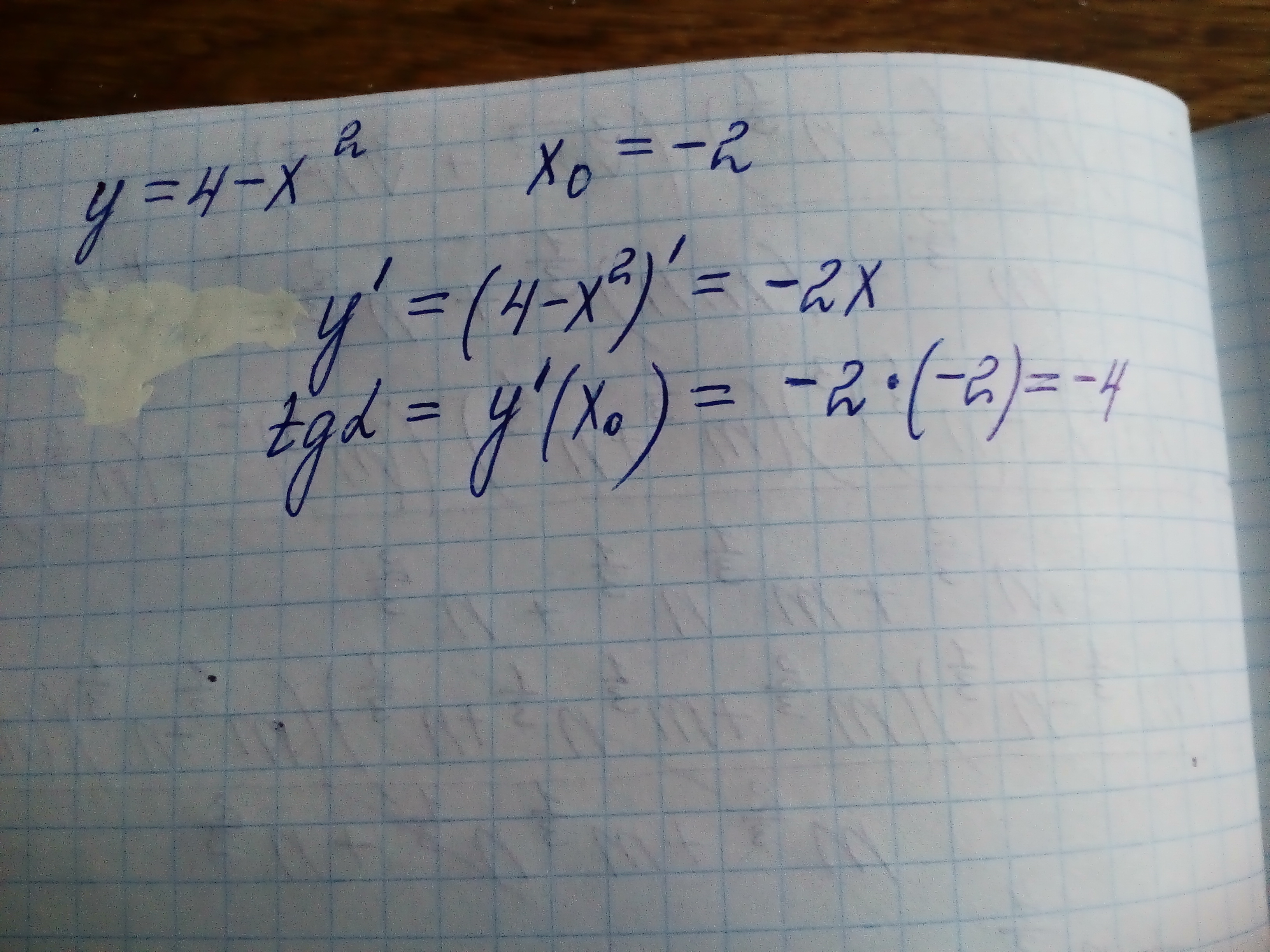 найдите тангенс угла наклона касательной, проведенной к графику функции у=4-x² в его точке с абсциссой х0=-2