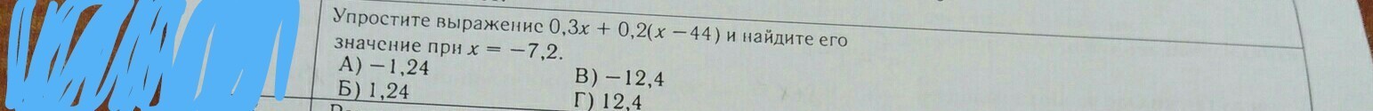 упрастите вырожение 0,3x+0,2 (x-44) и найдите его значение при x= -7,2