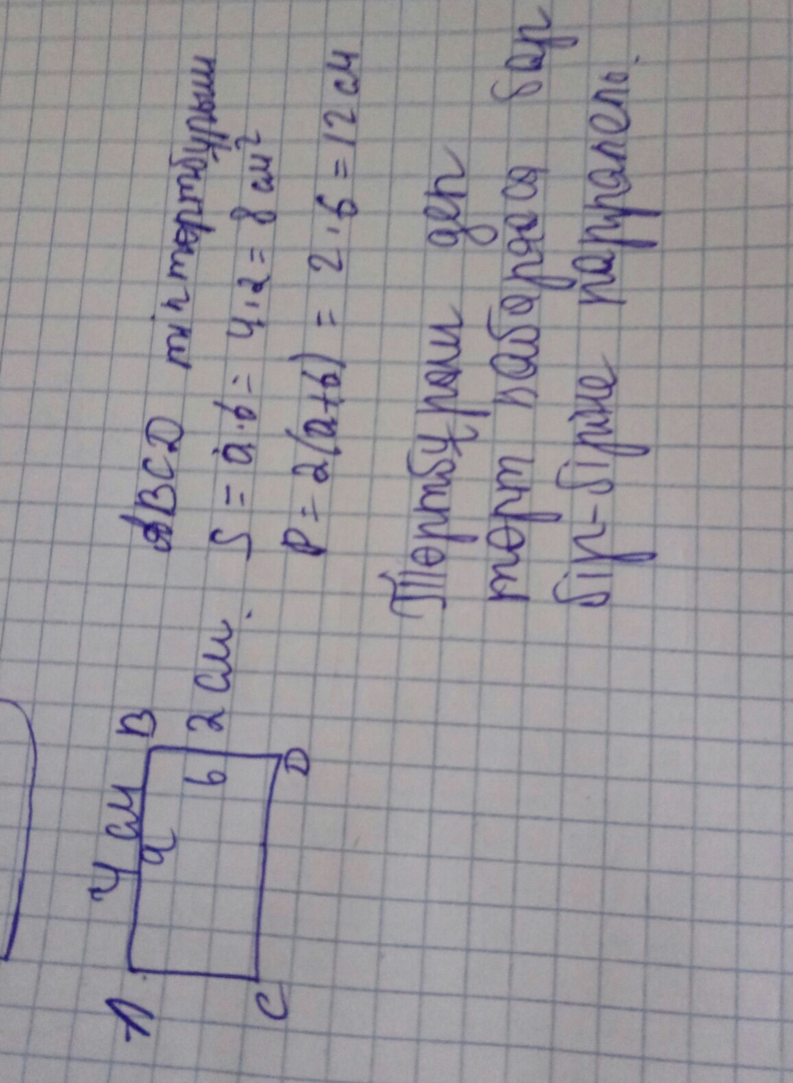Қабырғаларының ұзындығы 2см және 4см тік төртбұрыш сыз. Оны әріптермен белгіле және сол бойынша аталуын жаз. Неліктен ол тік төртбұрыш деп аталады? Оның қандай қасиетін білесің? Осы тік төртбұрыштың ауданын және периметрін тап. Өтінемін көмектесініздерші!!!