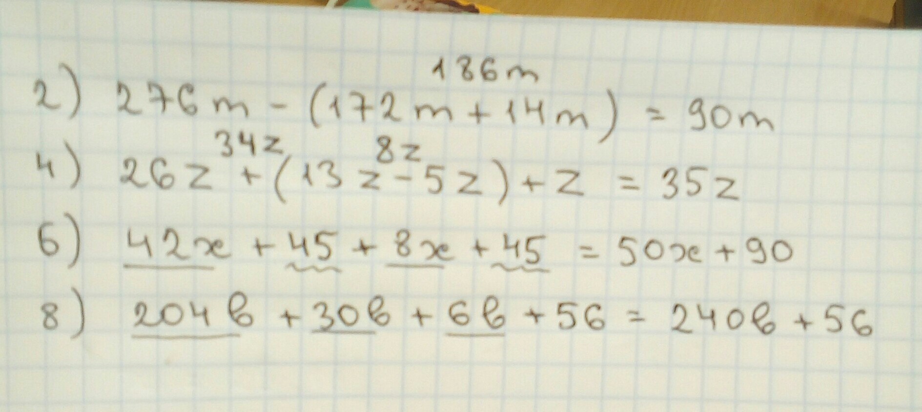 6) 42х+45+8х+45 здесь уже не только цифры с буквами,но так же присутствуют просто цифры. Как же это решать? Все еще проще! мы складываем отдельно цифры с буквами(как это делали в 2 и 4 примре) и так же складываем отдельно просто цифры и вот,что у нас получается: