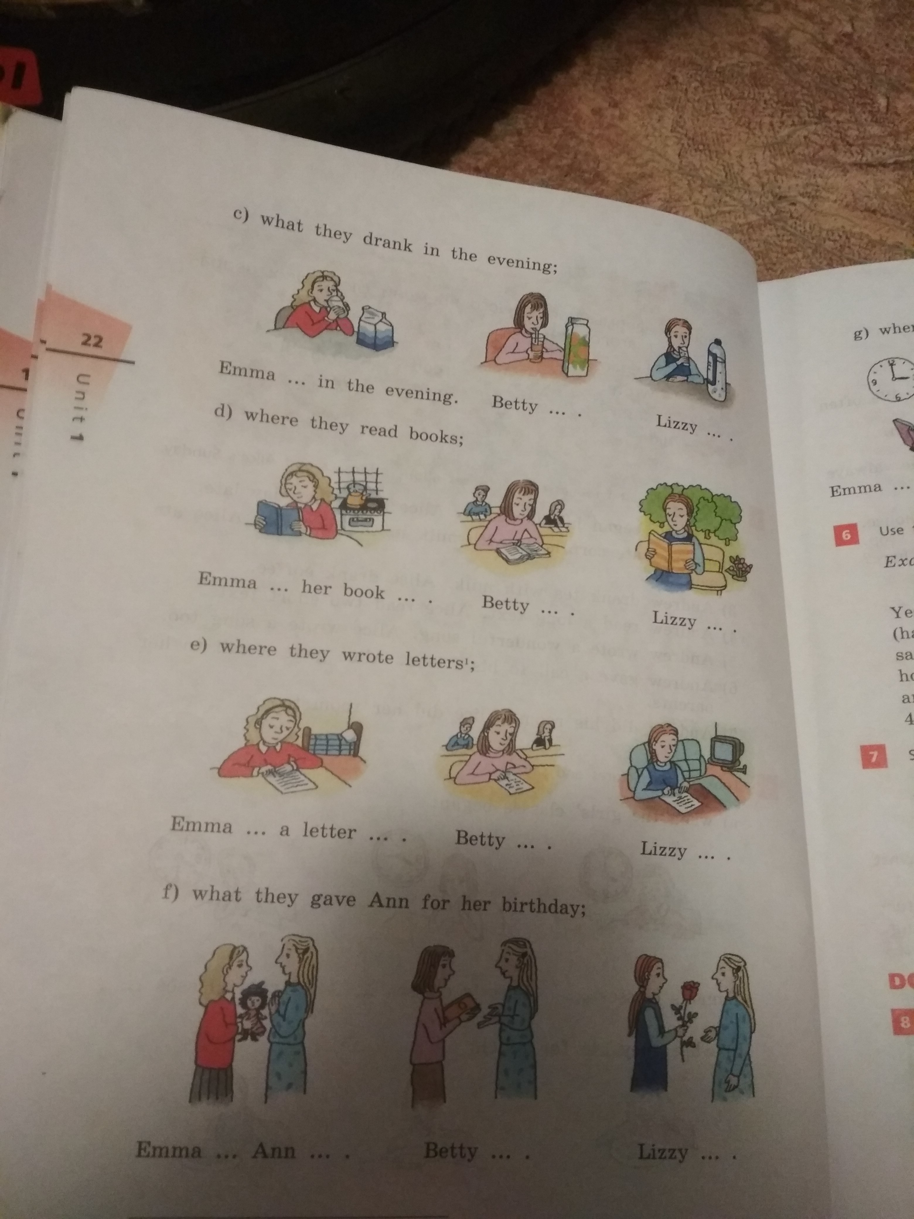 C) Emma drank milk in the evening. Betty drank juice in the evening. Lizzy drank water in the evening. D) Emma read her book in the kitchen. Betty read her book at school. Lizzy read her book in the park E) Emma wrote a letter in her room. Betty wrote a letter at school. Lizzy wrote a letter in the living room. F) Emma gave Ann a doll. Betty gave Ann a book. Lizzy gave Ann a rose.