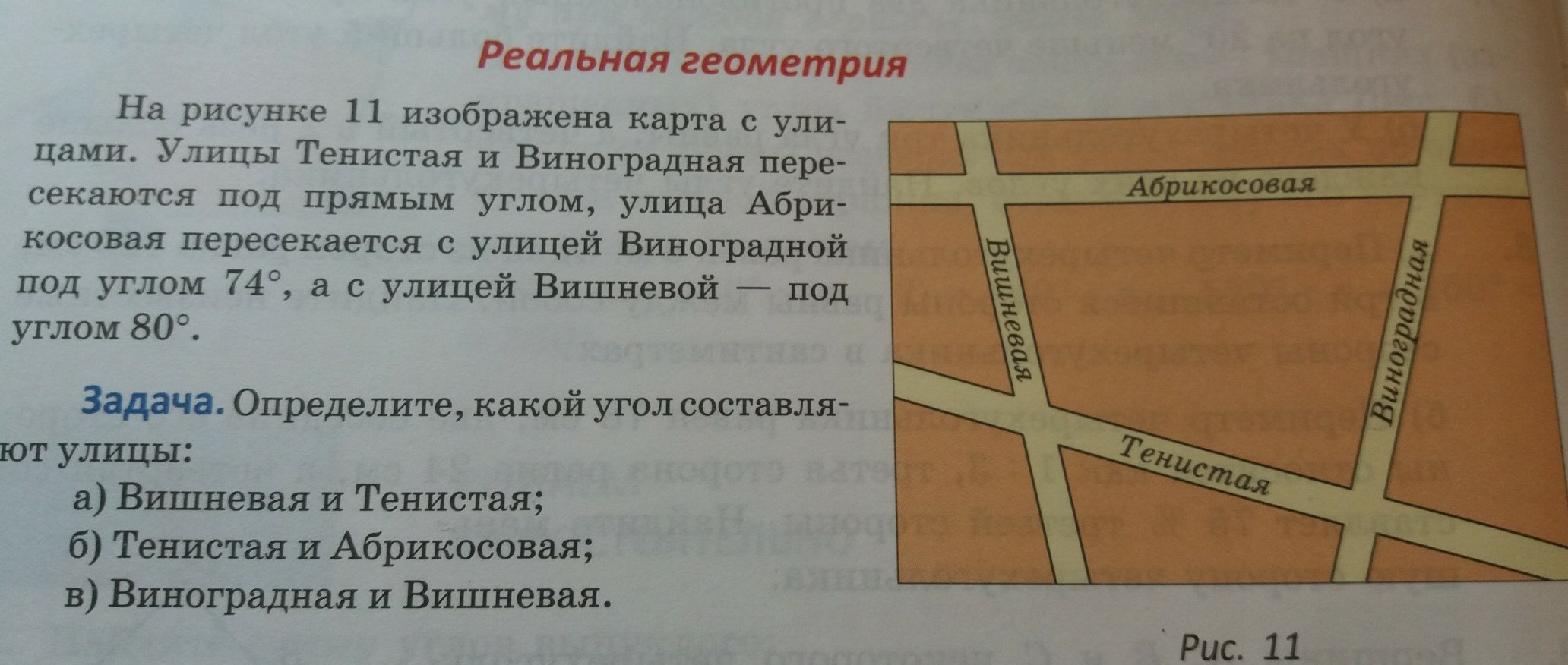 б)Мы не видим угла на рисунке, соответственно доводим линии улиц Абрикосовая и Тенистая до их пересечения и получаем треугольник, т.к.новый полученный угол равен 116 градусам, его смежный угол будет равен 64 (смежные углы дают в сумме 180 градусов), а смежный угол около Абрикосовой улицы равен 100(180-80), теперь у нас известно 2 угла из нашего треугольника, вычитаем их из суммы всех углов-180 градусов, соответственно 180-100-64=16 градусов