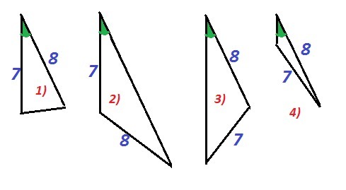 Сколько существует различных треугольников со сторонами 7 и 8, один из углов которых равен 20?