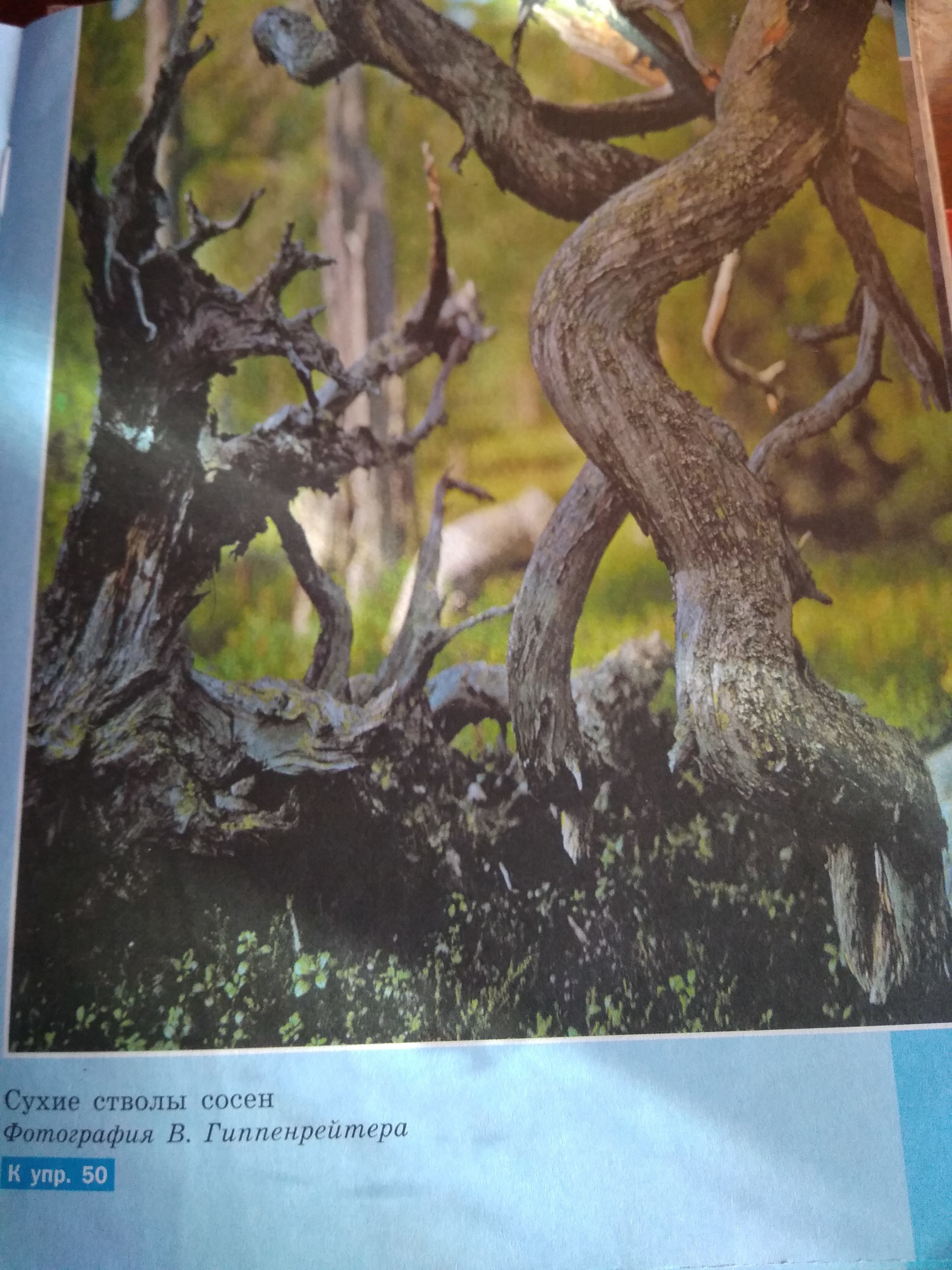На фотографии В.Гиппенрейтера «Сухие стволы сосен» все деревья искорежены, корни торчат вверх. Сухие стволы покрыты мхом и лишайником. Причудливые формы напоминают фантастических животных, извиваются как змеи. Будто лесные чудища вышли из темной чащи. Одна фигура напоминает хозяина леса. Другая угрожающе стоит на его защите. Лохматый корень, отшлифованный дождем и солнцем, похож на дракона. Сухие корни пронизаны зелеными иглами. Стоят эти образы, словно ссорятся или готовятся к таинственным действиям. На фоне зеленого леса эти фигуры выглядят угрожающе.