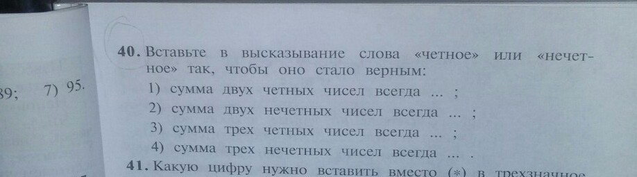4) Поскольку мы знаем, что сумма двух нечетных - четное число, утверждение эквивалентно проверке на четность суммы четного и нечетного