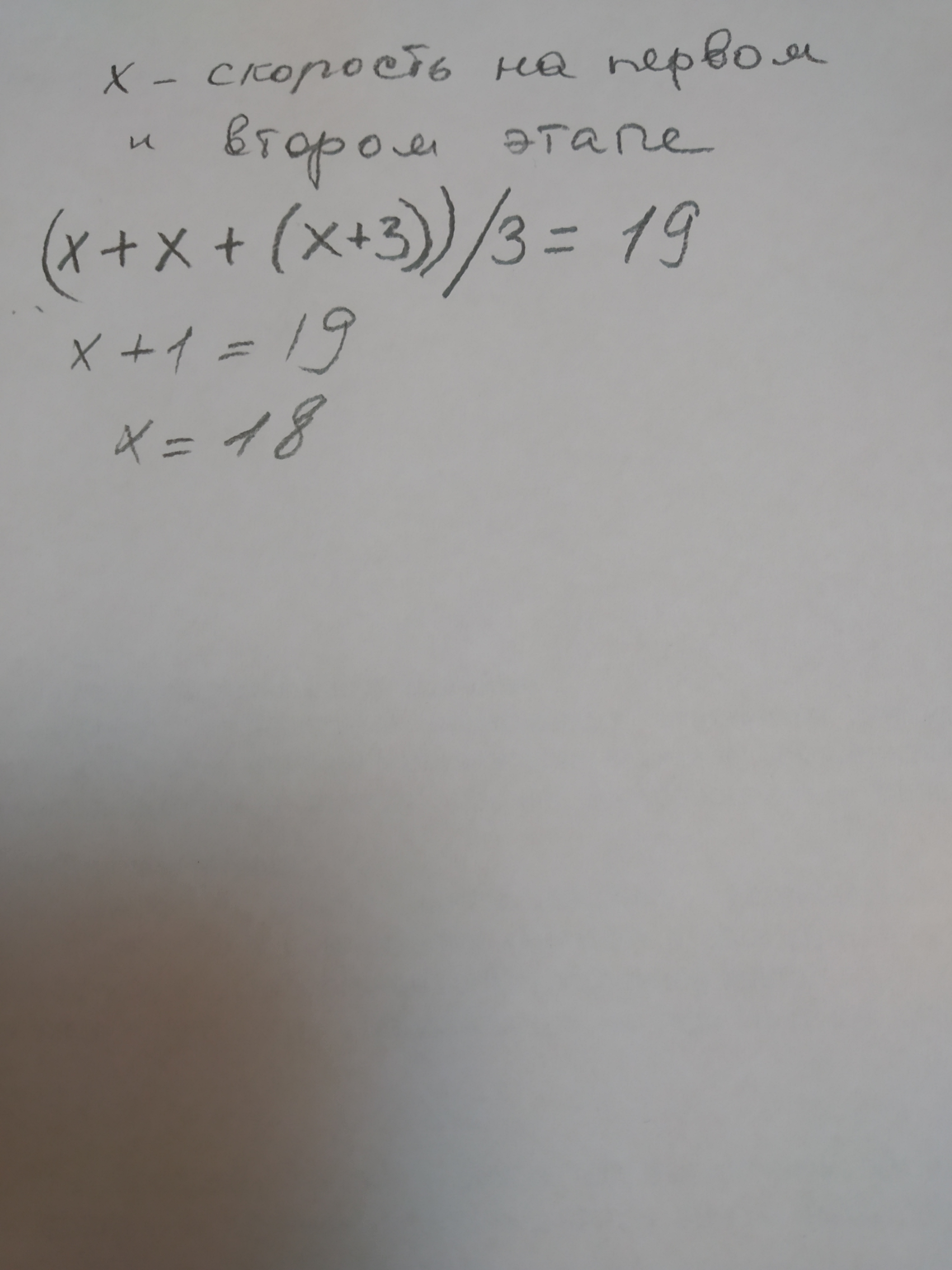 Средняя скорость велосипедиста в пути составила 19км / ч. первую треть времени он ехал на 3 км/ч больше, чем в оставшееся время. найдите скорость велосепедиста на квждом из двух этапов