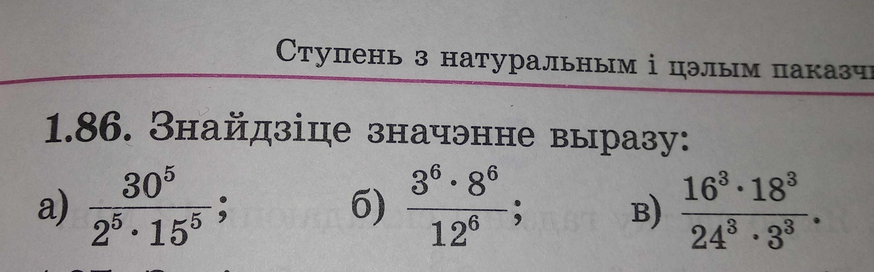 а) раскладываем 30 на 2 и 15=> сверху 2 в степени 5 умножим на 15 в степени 5, также как и снизу, сокращаем дробь и ответ 1