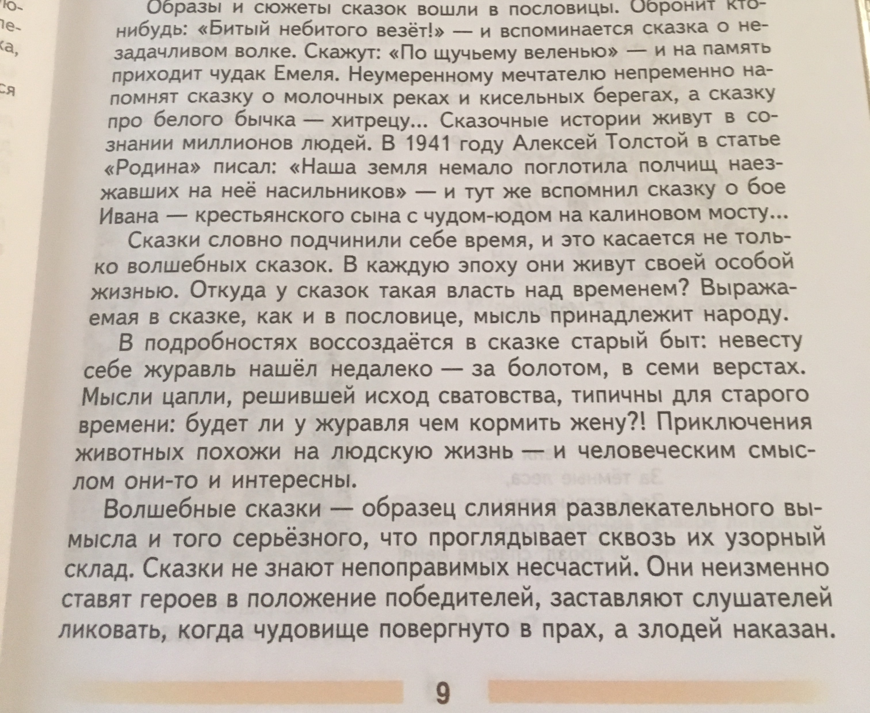 Образы и сюжеты сказок вошли в пословицы. Сказочные истории живут сознание миллионов людей . В 1941 году Алексей Толстой в статье,, Родина "писал :,,Наша земля немало полчищ наезжавших на её насильников"-и тут же вспомнил о бое Ивана-крестьянского сына с чудом-юдом на калиновом мосту. Сказки словно починили себе время, и это касается не только волшебных сказок. Выражающая в сказке, как и в пословице, мысль принадлежит народу. В подробностях воссоздается старый быт. Волшебные сказки - образец развлекательного вымысла и того серьёзного, что проглядывает сквозь их узорный склад. Так же сказки ставят героев в положение победителей,а злодей всегда остаётся наказанным.