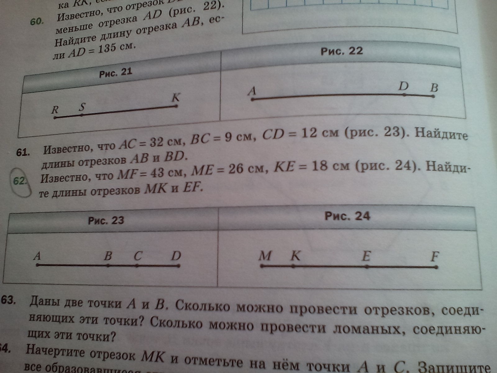 1)43-26=17(СМ)-отрезок EF; 2)17+18=35(СМ)-отрезок KF; 3)43-35=8(СМ)-отрезок MK; ответ:EF 17 СМ, MK 8 СМ.