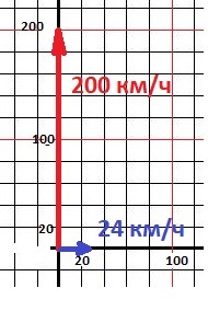 Выбираем масштаб по осям - 4 км/ч - это 20 км/ч в клетке тетради.