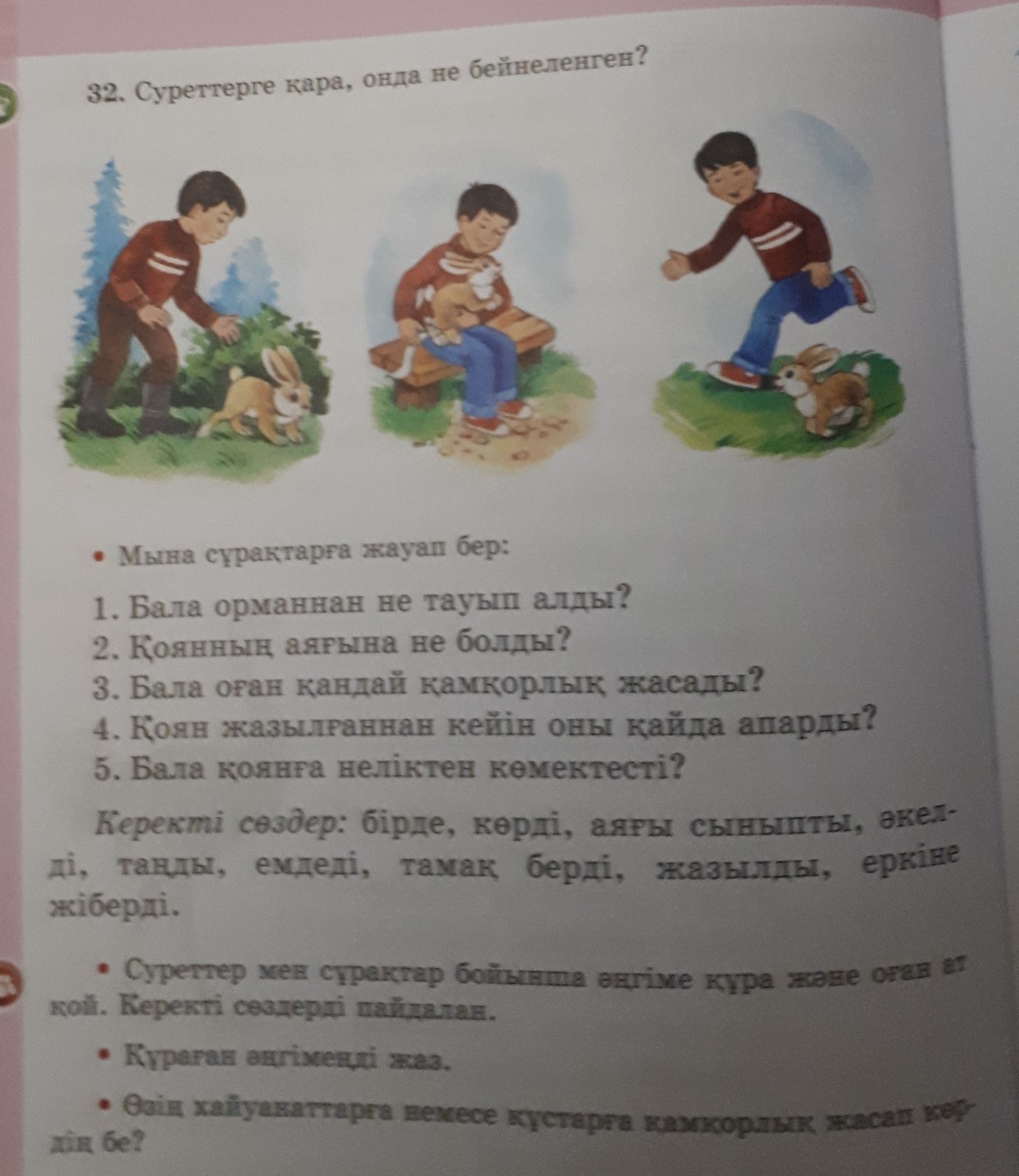 Бырде бала орманнан коян корип калды .Кояннын аягы сыныпты калыпты.Бала оны уйыне акелды,аягын танып емдеды,тамак берди.Коян жазылгансын они еркине жиберды.