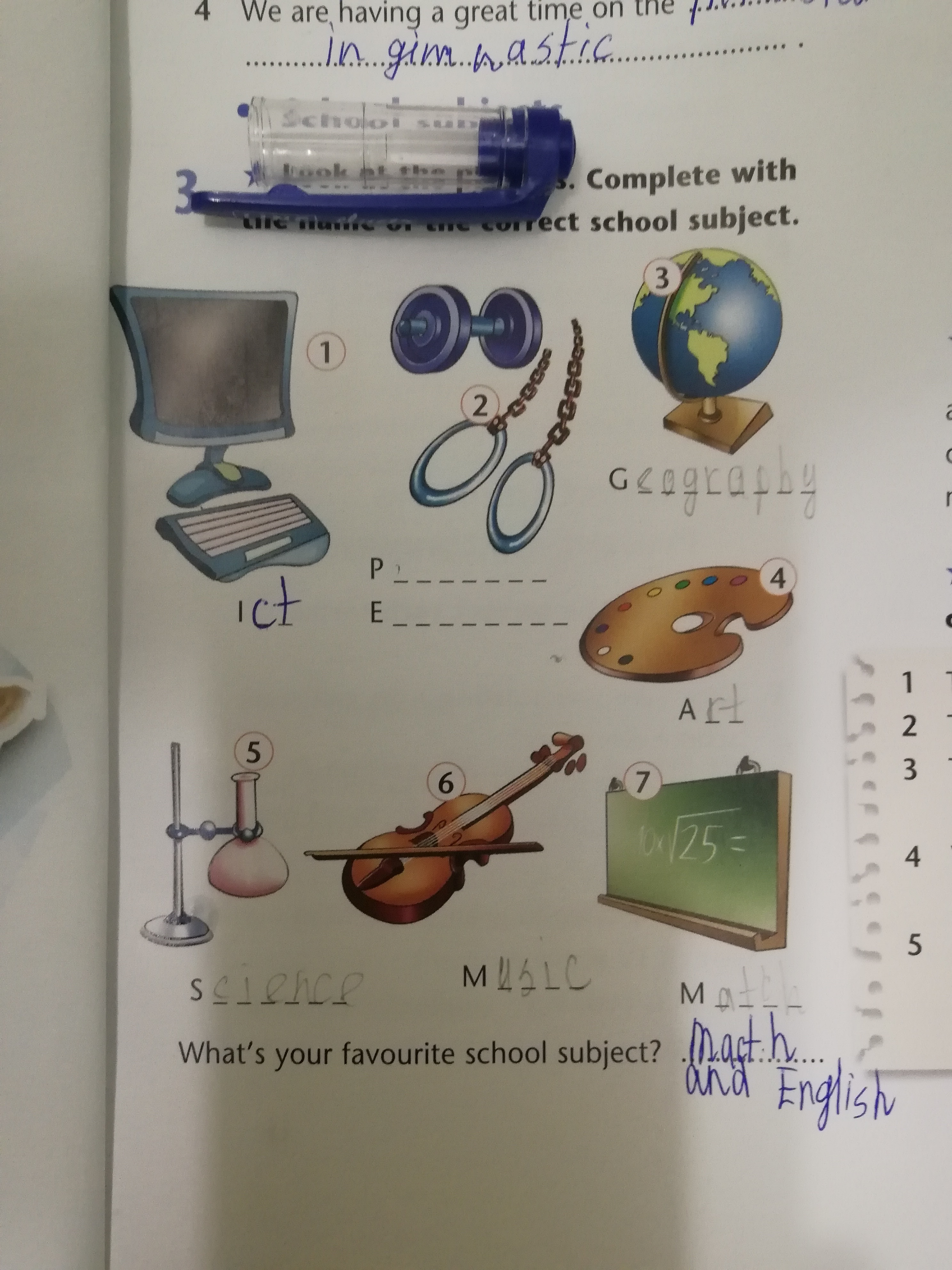 1) ICT. / 2) Physical Education. / 3) Geography. / 4) Art. / 5) Science. / 6) Music. / 7) Maths.