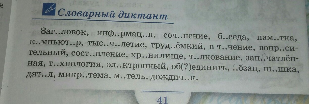 Заголовок, информация, сочинение, беседа, памятка, компьютер, тысячелетие, трудоёмкий, в течение, вопросительный, составление, хранилище, толкование, запечатленная, технология, электронный, объединить, абзац, шашка, дятел, микротема, метель, дождичек.