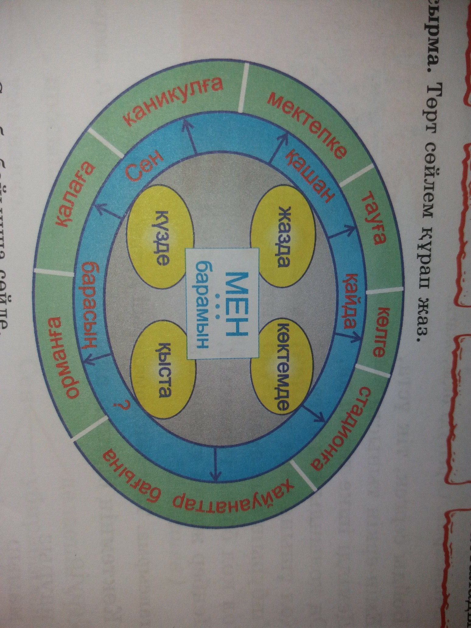 мен жазда көзге барамын. мен көктемде қалаға барамын. сен қыста тауға барасын. сен күзде стадионға барасын.