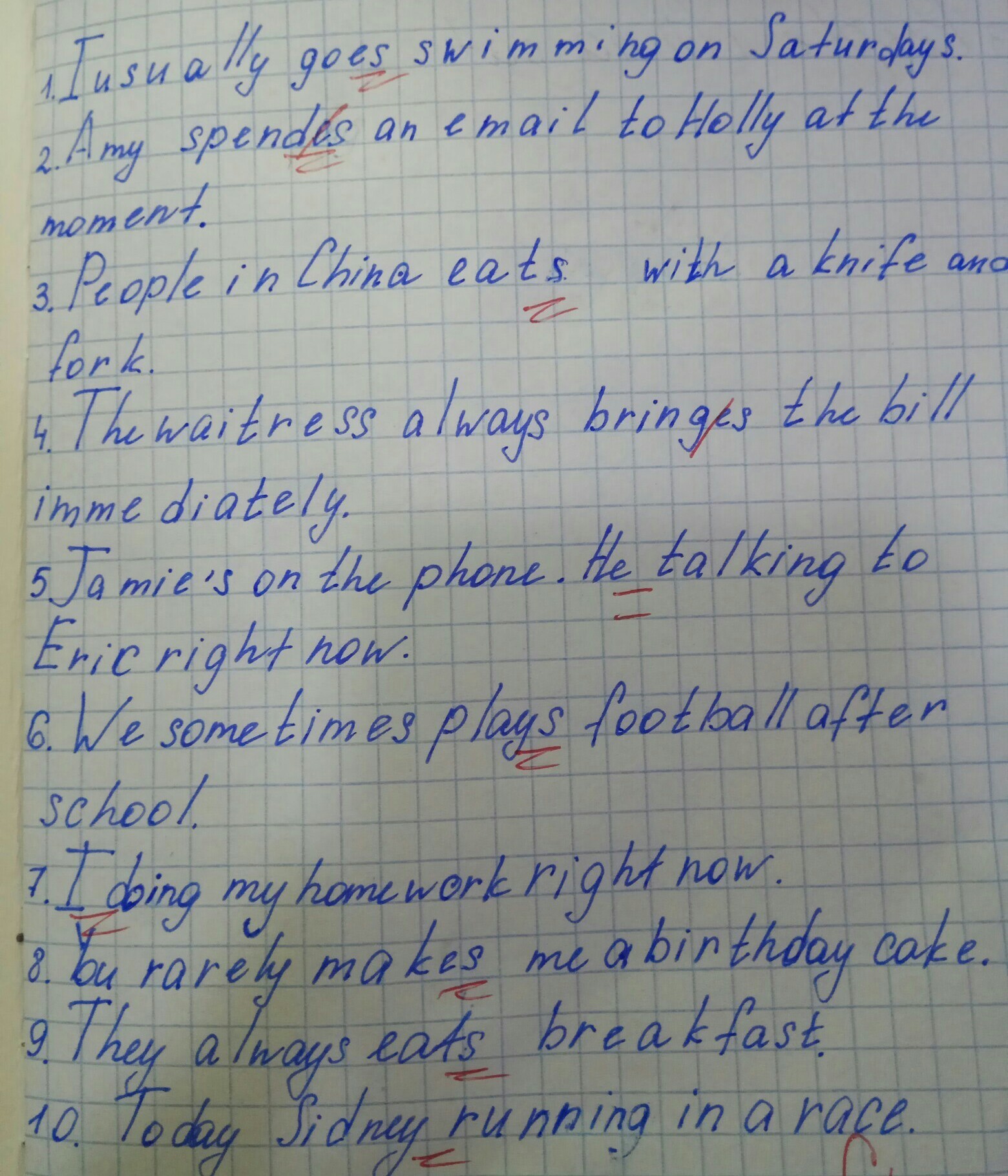 1) I usually GO swimming on Saturdays. 2) Amy IS SENDING an email to Holly at the moment. 3) People in China EAT with a knife and a fork. 4) The waitress always BRINGS the bill immediately. 5) Jamie's on the phone. He IS TALKING to Eric right now. 6) We sometimes PLAY football after school. 7) I AM DOING my homework right now. 8) You rarely MAKE me a birthday cake. 9) They always EAT breakfast. 10) Today Sidney IS RUNNING in a race.