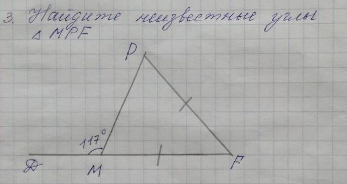 ∠М=180-117=63°. ∠F=∠M=63°. ∠Р=180-2*63=180-126=54°